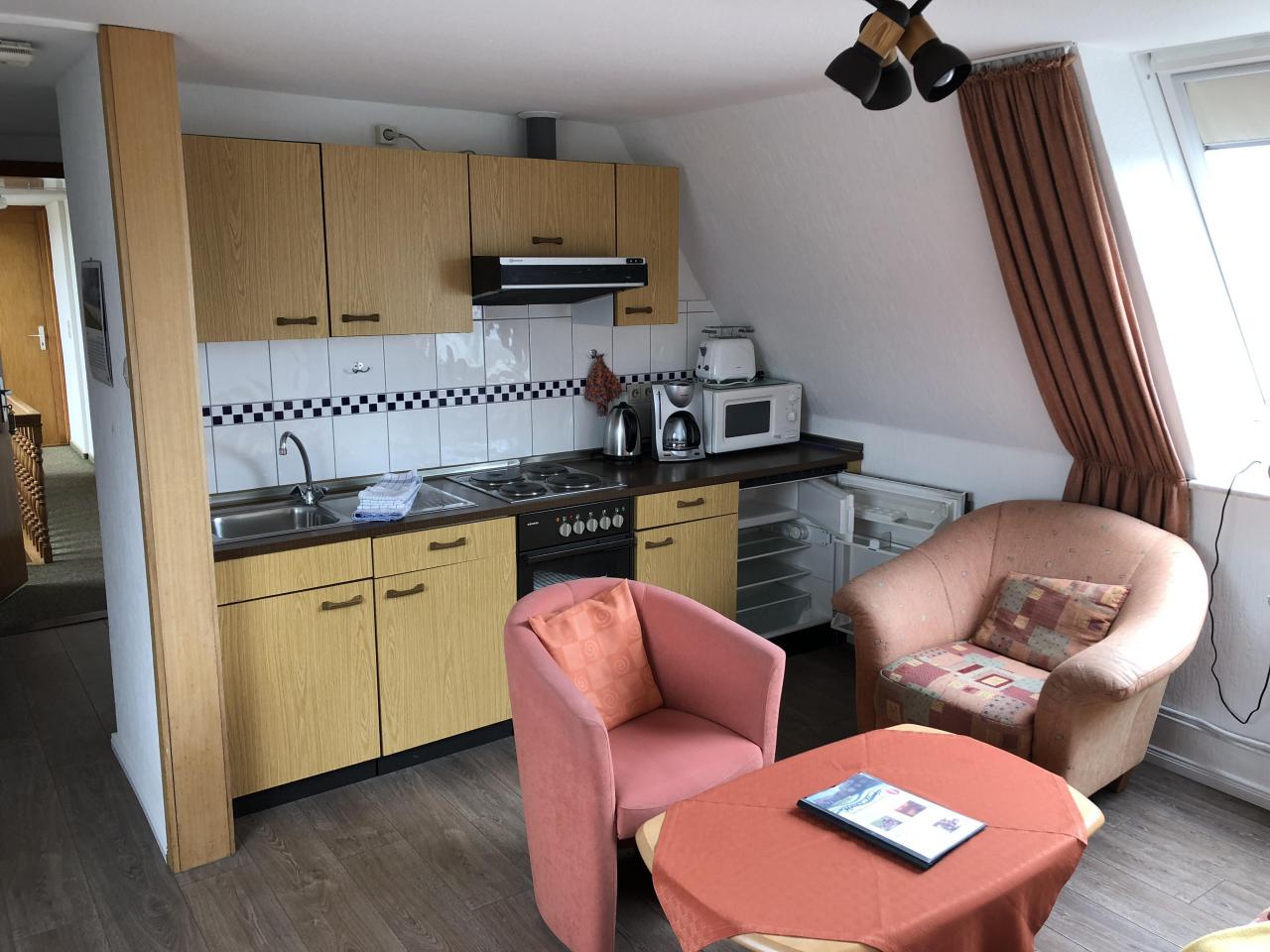 gemütliche, ostfriesische Wohnung im Dachgeschoß mit Blick in allen Himmelsrichtungen, Wattenmeerblick, Nordseeblick, Küche mit Spülmaschine , Mikrowelle, Kühlschrank, Kaffeemaschine, Wasserkocher etc., Wohnzimmer mit Sat.TV, Badezimmer, Schlafzimmer mit 3 Betten