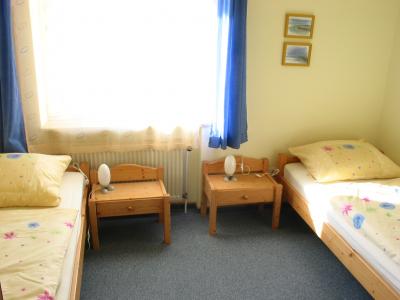 Vom Wohnzimmer mit moderner Schlafcouch und gemütlichem Essbereich können Sie die dazugehörende Südterrasse betreten um den Ausblick und das Meeresrauschen zu genießen. Schlafzimmer mit getrennten Betten; Duschbad mit Toilette.