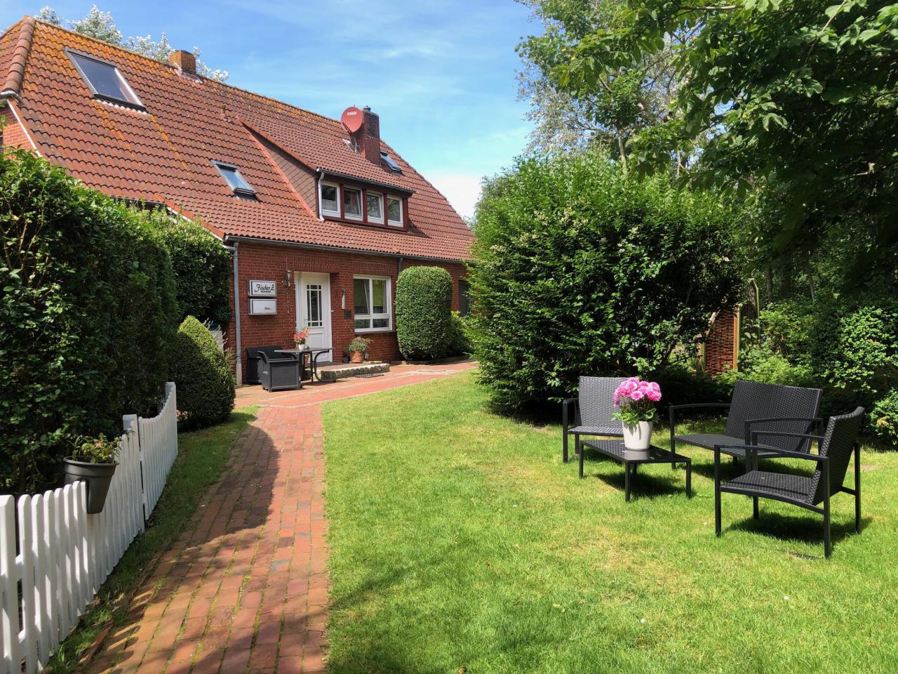Ruhige, reizvolle Lage unserer Pension mit Zimmern und Appartements zwischen Wattenmeer und den grünen Dünen, mit einem geschützt liegenden Garten mit Liegewiese und Sitzecken zur Erholung "pur".