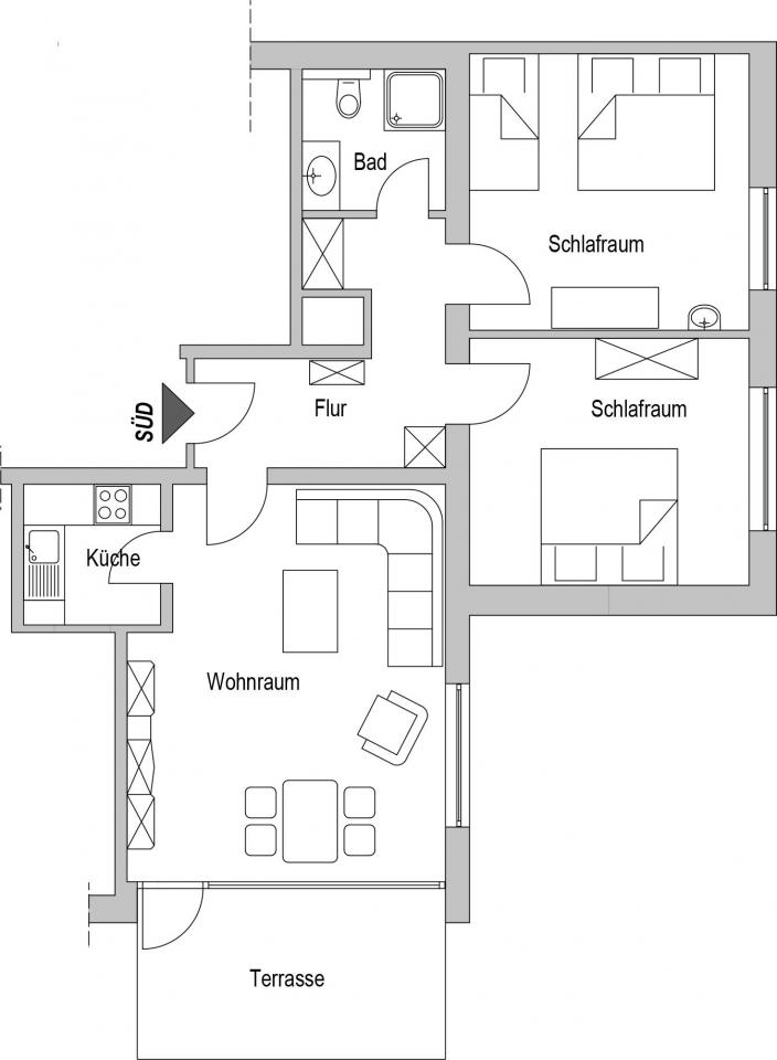 Terrassenwohnung, 1 Schlafraum für 3 Pers., 1 Schlafraum für 2 Pers., Kinderbett mögl., Wohnraum mit Essecke, Du/WC, Terrasse nach Westen - Küche Neu 2013 -
