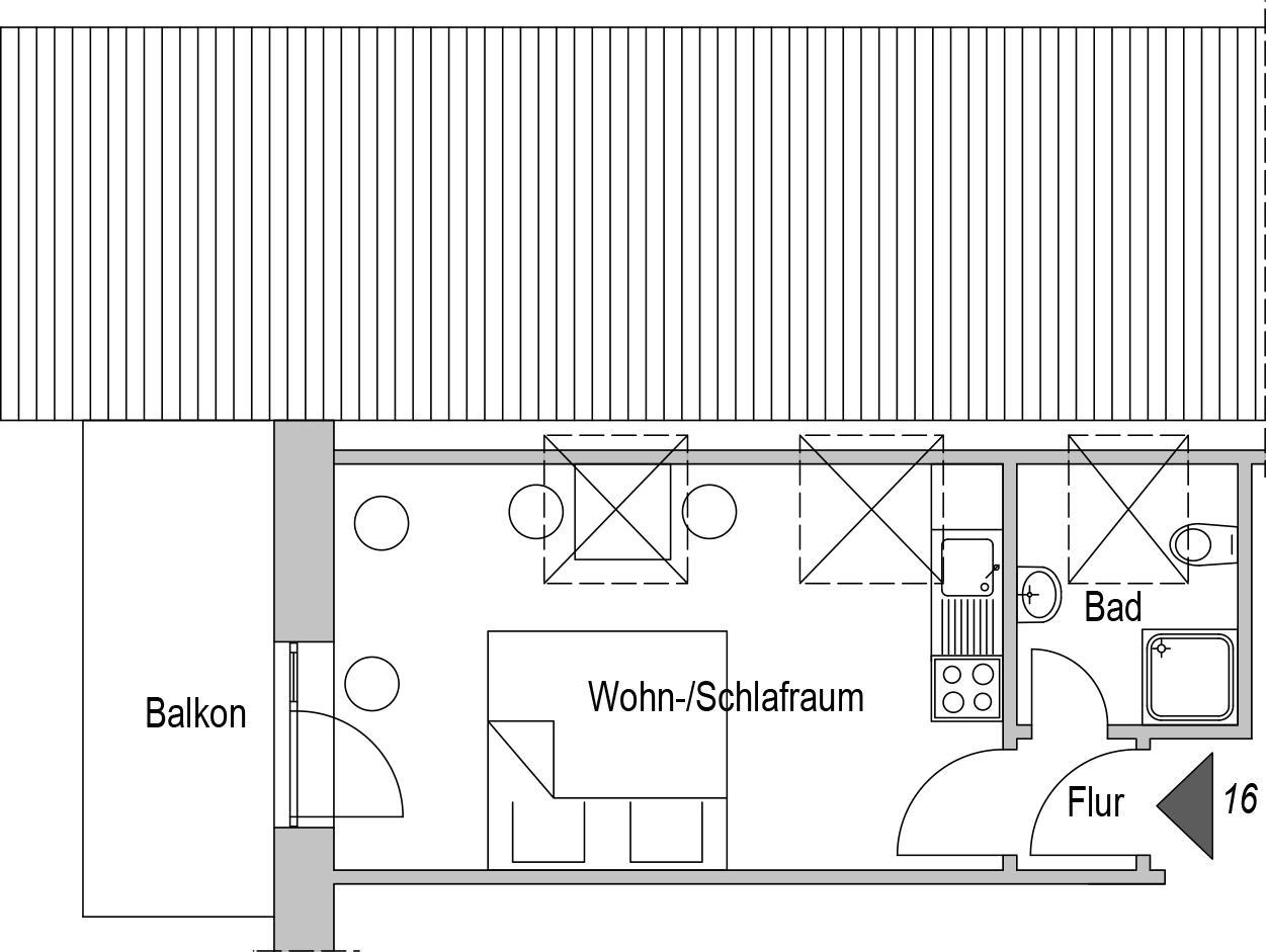 Appartement für 2 Pers., 2. Etage, Wohn-Schlafraum mit Schrank-Klappbetten, Essecke, Balkon, Seeblick Nordseite und zum Strand
