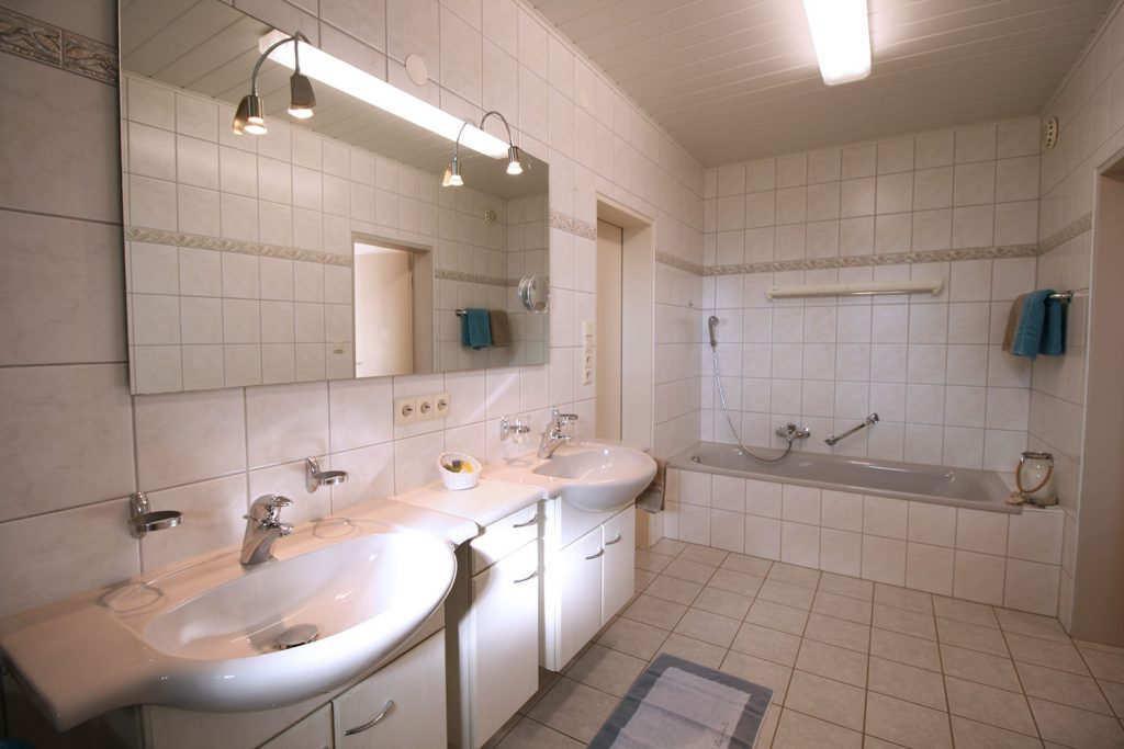 Ferienwohnung für 2 - 3 Pers. Hochparterre, 1 DoZi + 1 Wohn-Schlafraum für 1 Pers., gr. Balkon (Südwest), großz. Badezimmer mit Badewanne, Dusche, Bidet, extra WC, 2. Bad mit Dusche, WC