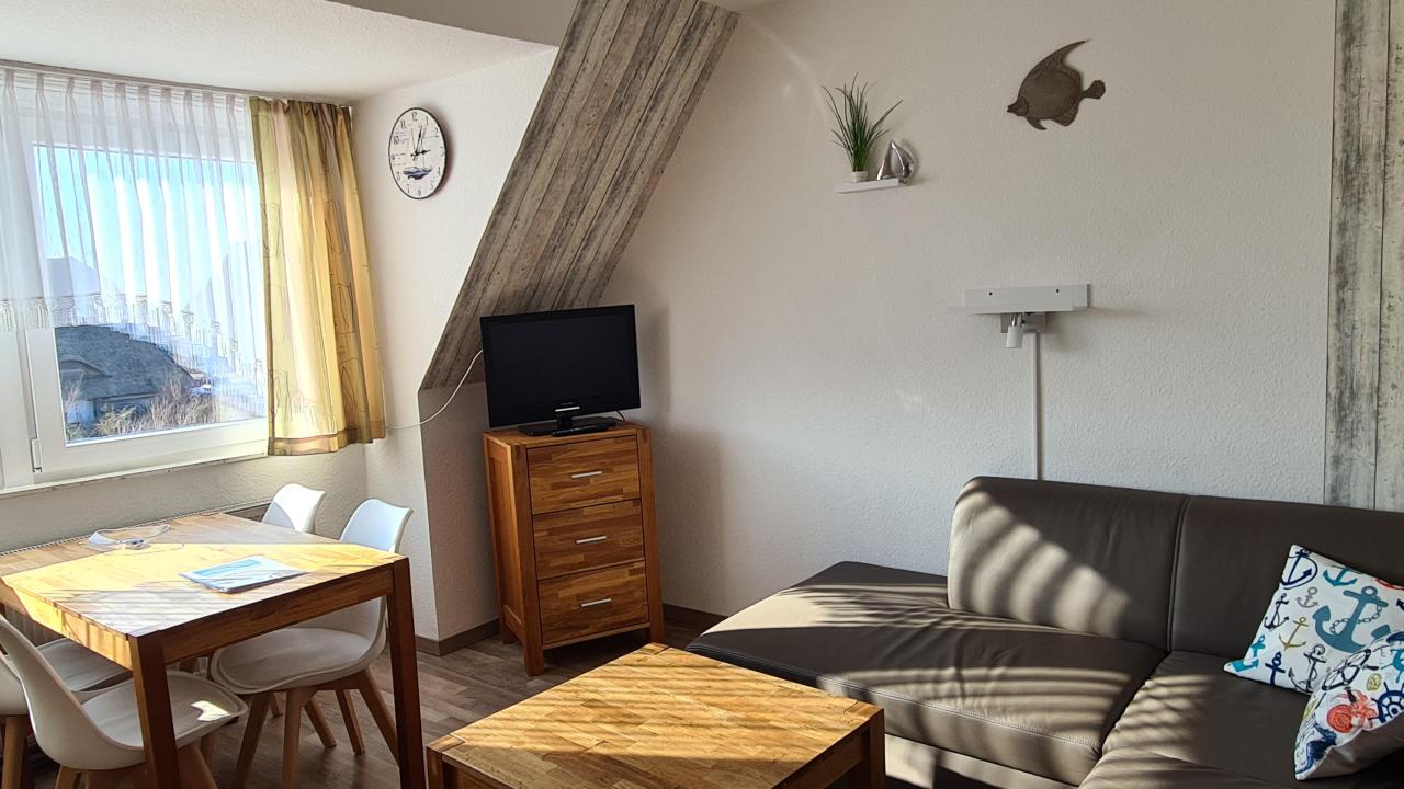 Erstes Obergeschoss für 4-5 Personen, Wohnraum mit Sitzeck und Kaffeetisch, Esstisch, TV,