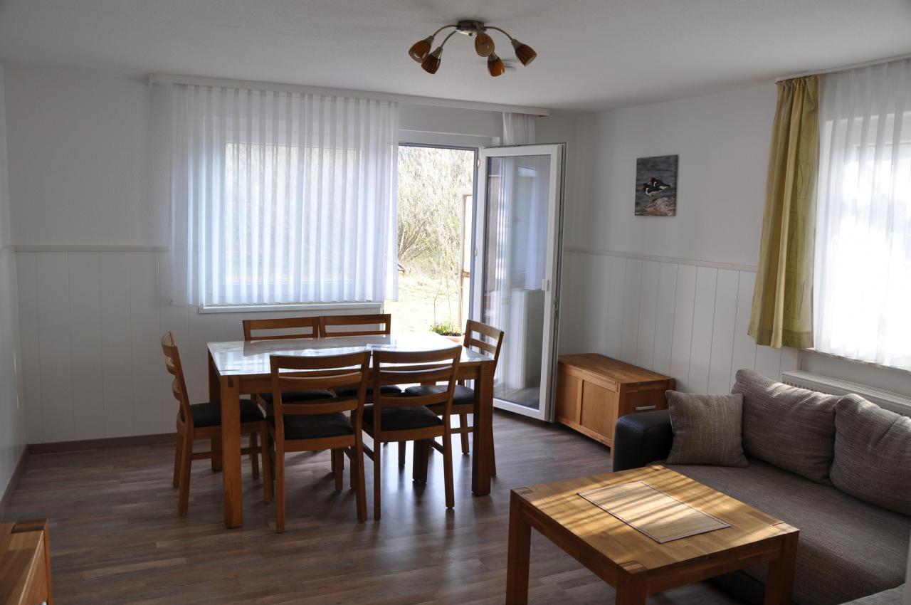 Wohnraum mit Sitzeck und Kaffeetisch, Esstisch, TV.